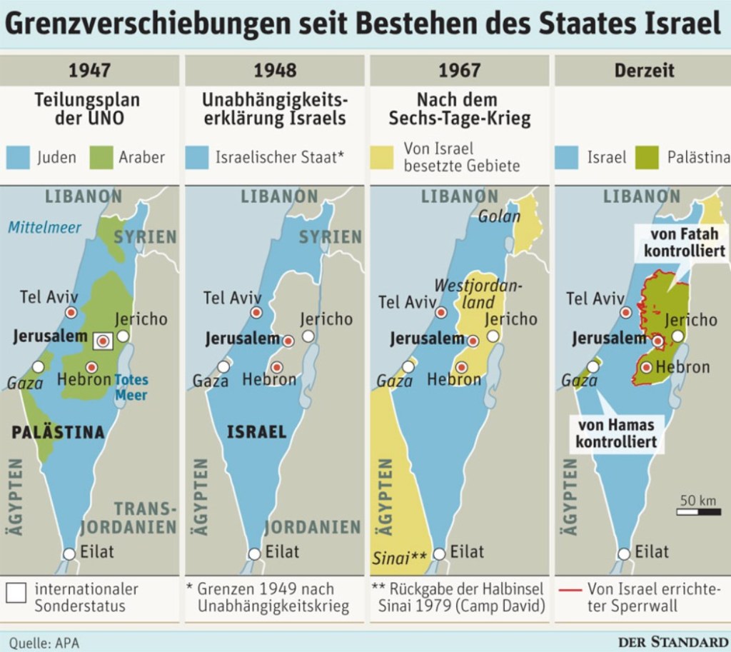 Die konkrete Anschuldigung an Israel lautet: Vertreibung der angestammten Bevölkerung Palästinas und Einverleibung ihres Territoriums. Der Wahrheitsgehalt dieser Anschuldigung lässt sich nicht bestreiten, wenn man das Staatsgebiet Israels zum Zeitpunkt des Teilungsplanes der UNO 1947 mit der heutigen Situation vergleicht. Derzeit sind Bestrebungen Israels im Gange, das Westjordanland zu annektieren und die Vertreibung palästinensischer Familien aus Ostjerusalem ist ein beständiger Vorgang, ferner hält Israel die Golanhöhen besetzt und beansprucht für sich Wasser des Jordans zu Lasten der arabischen Bevölkerung. Israel reagiert auf diese Kritik mit dem Wort ‘antisemitisch’, was soviel wie rassistisch, diskriminierend oder böse bedeutet. Erschwerend kommt hinzu, dass Israel weder eine Verfassung hat, noch festgelegte Landesgrenzen – ein Umstand, der jede andere politische Gruppierung, die Anspruch darauf erhebt, ein anerkannter Staat der internationalen Gemeinschaft zu werden, lächerlich aussehen lassen würde.